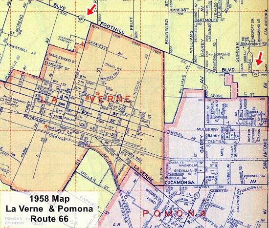The 1940s Caltrans road map shows Foothill Blvd. (US 66) running through unincorporated land west of Claremont. At that time the Pomona city limit was further south as the town was centered on US 60, 70 and 99. The built-up area of Pomona didn't reach US 66 in the north as that was an area of open fields.