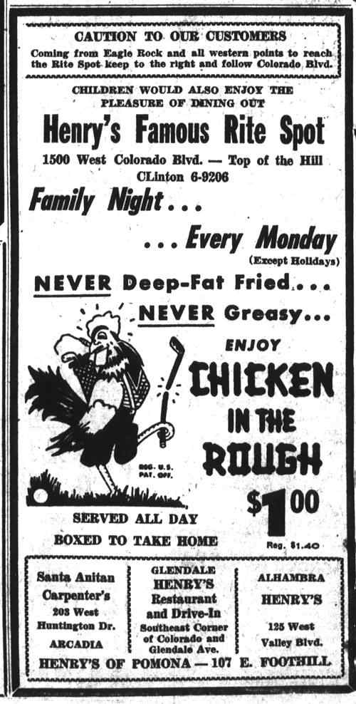 Henry's also had the Carpenter's in Arcadia and another Henry's Drive In in Alhambra. They all featured the "Chicken in the Rough" on their menus, named so because Henry's had once been part of the Oklahoma-based Chicken in the Rough chain. This chain was created in 1936 by Beverly and Rubye Osborne and grew nationwide with 250 restaurants. It's logo was a rooster with tartan trousers, a golf stick in its left foot, a bag of golf clubs on its shoulder, and a golf ball hidden in the grass ("rough" in golfer terminology).