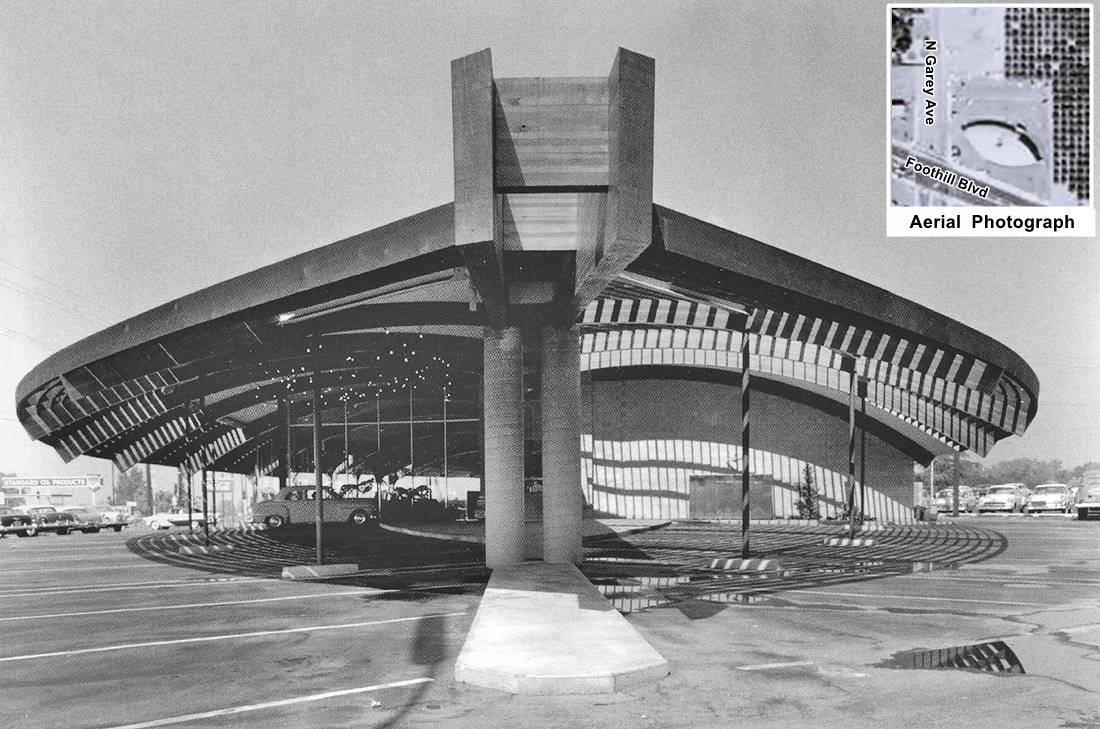 On the NE corner at 107 E Foothill was the amazing Space Age-styled building that housed Henry's Drive-In Restaurant. It was designed in 1957 by John E. Lautner (1911-1994) who created a vast laminated wood structure that arched over the interior dining area and the outer drive-in section. It formed a shell with an oval shape, with sharp tips. Lautner had also designed the Glendale restaurant in 1947 and the Henry's Famous Rite Spot in Pasadena in 1953.