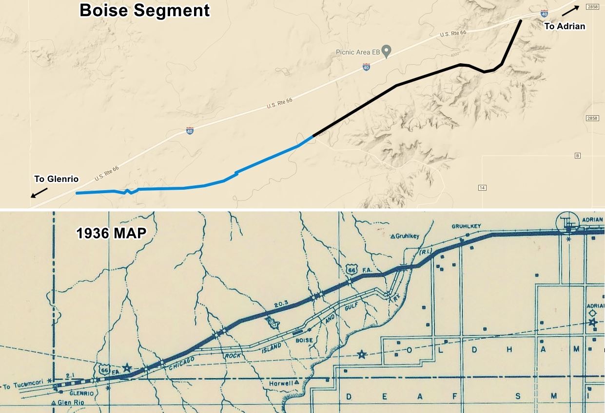 Its eastern terminus is at Exit 15. The former depot or siding of Boise (see map showing its location) is 1 mile south of I-40 along an unnamed road, and the exit point is 11.5 mi east of Glenrio, and 11.5 mi west of Adrian.