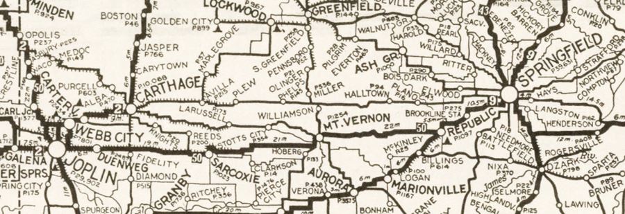 These "auto trails" were unpaved dirt-surfaced roads, the one marked #50 was the Ozark Trail and it went through Mt. Vernon and Sarcoxie, roughly where I-44 is now aligned, south of Route 66. Trail #2 from Carthage to Joplin was the "Jefferson Highway".