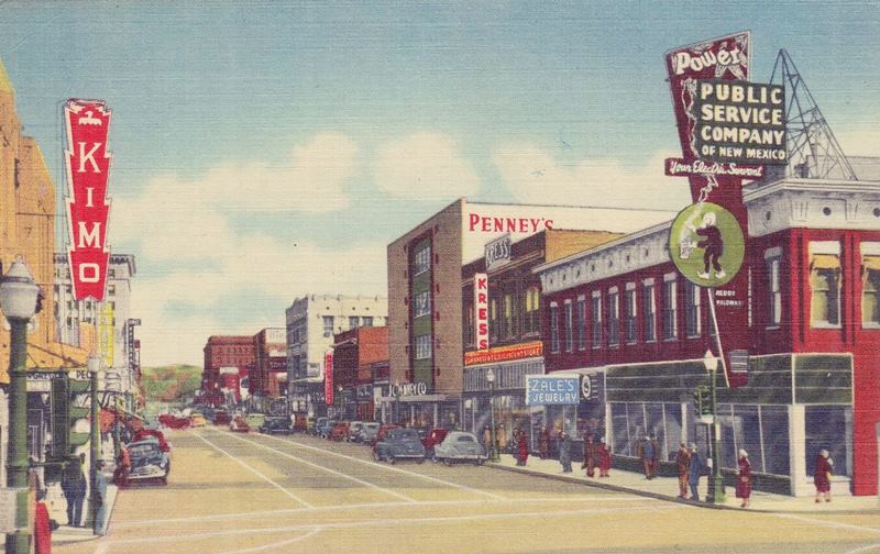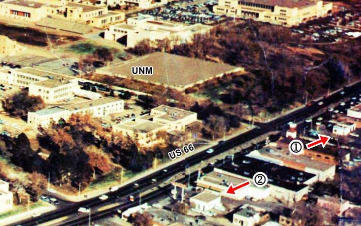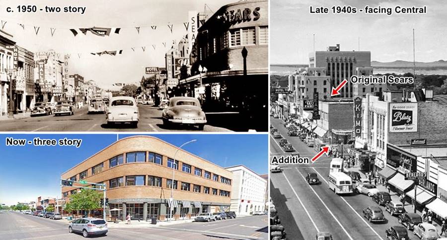 Turn around and head back to Kimo on Central Avenue. Across 5th from Kimo, on the NW corner at 505 W Central was Sears Roebuck and Co. The original building dates back to 1937; it was built by Dr. Lovelace (2) as a two story building with a full basement facing Central in Streamline Moderne lines. In 1948 Carl's lounge was torn down, and an addition was built on the corner and along 5th (3) with a modern curved facade, a third story was added after a fire in 1952. It is still standing. Click on the thumbnail image to see the building through each of these stages: facing Central in the 1940s, two story on the corner, late 50s and nowadays.