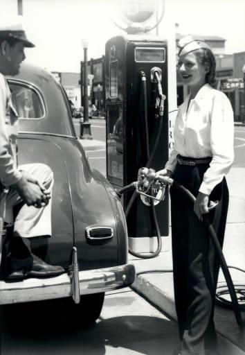 The picture below shows a woman service station attendant pumping Texaco branded gas into a 1940 Chevrolet at the Firestone Service.