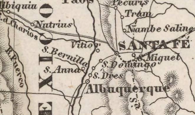 Until the early 1800s, the town was very probably known as Bernalillo (now further south). The thumbnail map published in 1852 (click on it to enlarge it) shows Santa Fe, and south of it Santo Domingo, S[anta] Anna and between them, S. Bernalilla (current Algodones), further south are S. Dres (Sandia?) and Albuquerque.