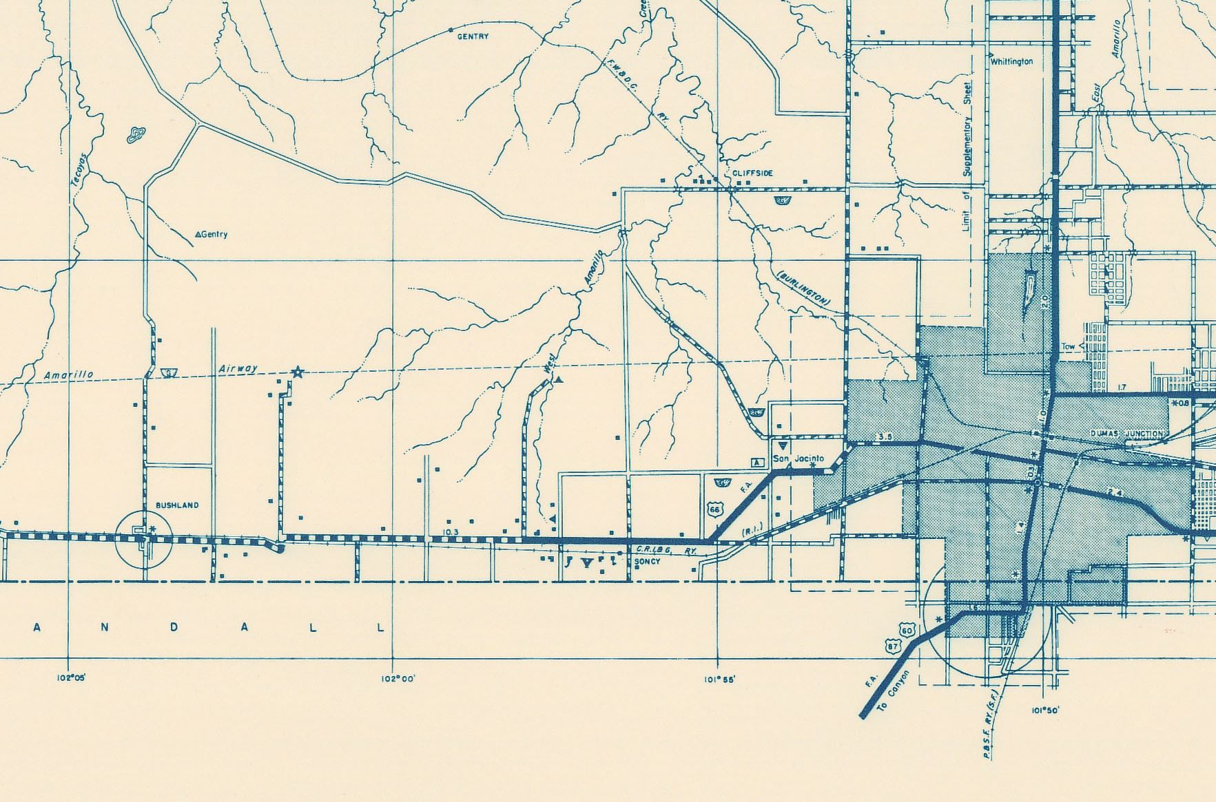 The 1932 and 1956 alignments meet on the western side of the airport at the "Triangle" and head into Downtown Amarillo: