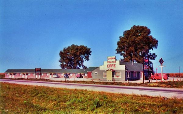 Drive from Lincoln towards Broadwell. The four-lane alignment ends at the access to I-55's Exit 123. from this point westwards the former southbound lanes are buried by I-55's norhtbound ones. Ahead, at the former crossroads with 1200th Street, 2 miles north of Broadwell was the Logan Center Motel, on the western side of the old alignment. It was torn down when I-55 was built over the property. You can see it in this 1957 aerial photograph, and this map marks the spot. Nothing remains of it. Below is a vintage postcard of it that reads "Logan Center Motel, Restaurant, Bar, Service Station man to check your car while you wait or eat... phone 1796 for reservations. F. G. Margonis, Prop."