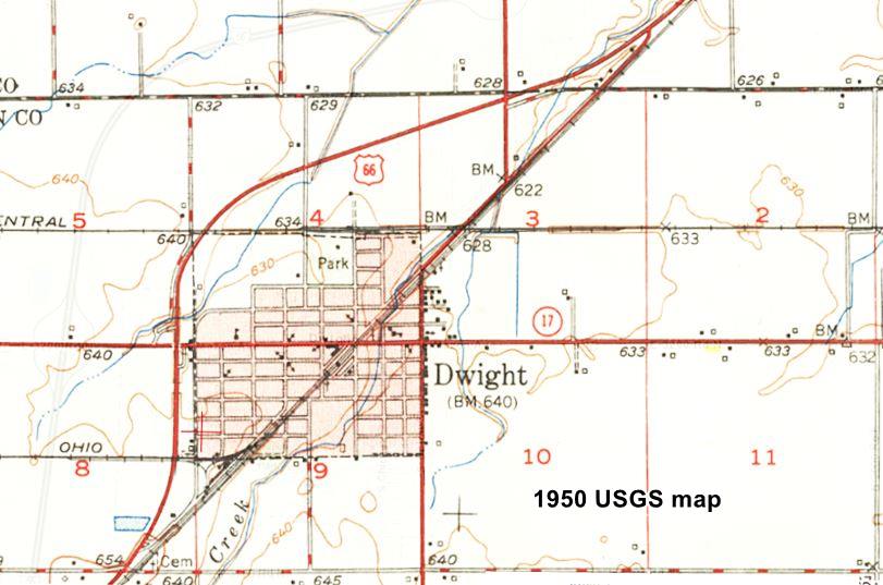 Then, it was realigned and the original 1926 US66 alignment headed with a SW course from Gardner to Dwight until it was decertified in 1977, our map shows its alignment with a burgundy line.
