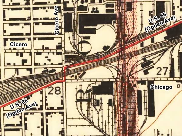 The Chicago, Burlington and Quincy Railroad that ran with an east to west course, crossed linked to the other two railways here and crossed Ogden. It was a dangerous grade place for a grade crossing so the original alignment solved the problem by running north of the CB&Q railroad and then turning sharply south into the Cicero Ave underpass, and then again sharply west along Ogden, as shown in the map below (Route 66 runs along the red line).