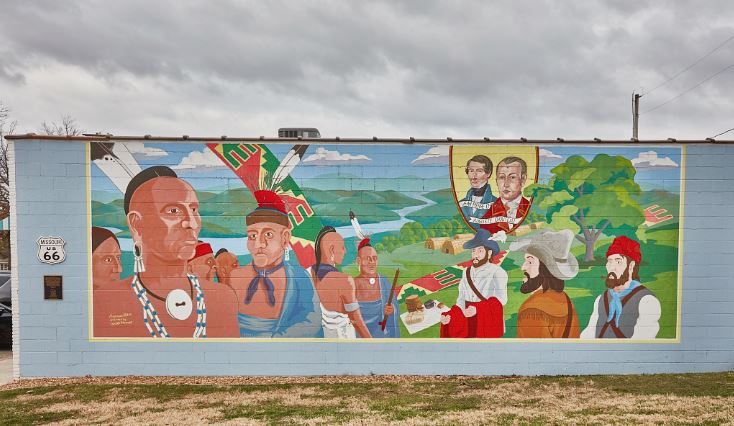 Next to Barnett's mural is another one, pictured above, the "Osage Meeting in Missouri" mural. It depicts Osage people meeting French trappers and explorers, Auguste and Jean Pierre Chouteau in the 1700s.