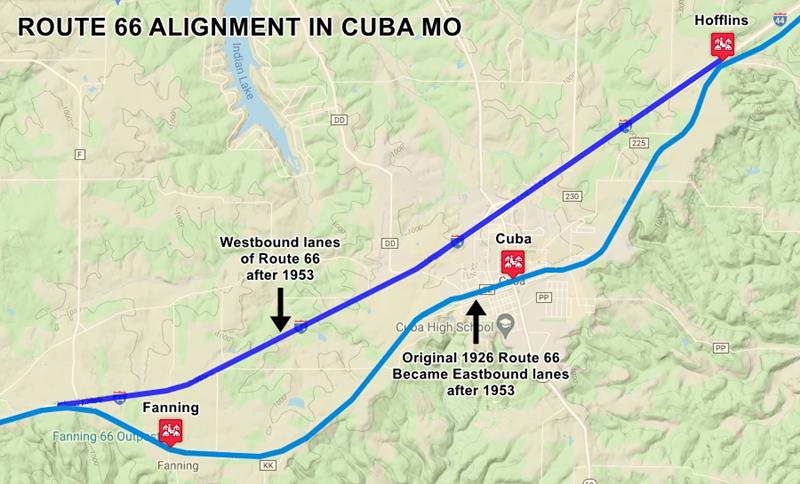 Starting in the early 1950s Route 66 became too congested in the neighboring town Cuba. So it was upgraded to a four-lane highway in which the original 1926 Route 66 alignment through Hofflins became the two eastbound lanes of the new "super highway" between Hofflins and Fanning (Pale Blue in the map below). Two additional new lanes were built (shown in Blue in the map below - click thumbnail image to enlarge) from what is now Exit 203 to Exit 210 at Hofflins to carry the westbound traffic. This is the map of the 1926 Route 66, later the EB lanes, from Hofflins to Fanning through Cuba.