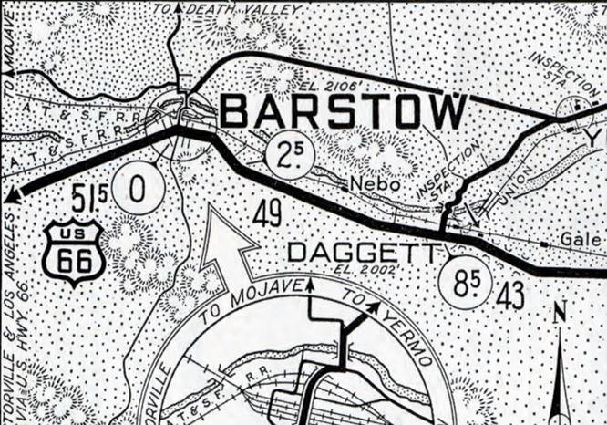 Just before being incorporated into the brand new US Highway 66, in 1926, the road had a straighter course west of Newberry going through Minneola, passing Gale station and Dagget, which is shown as having a Post Office. It was also the terminus of the Arrowhead Trail to Salt Lake City. Nebo Station appeared before Barstow but no services were provided.