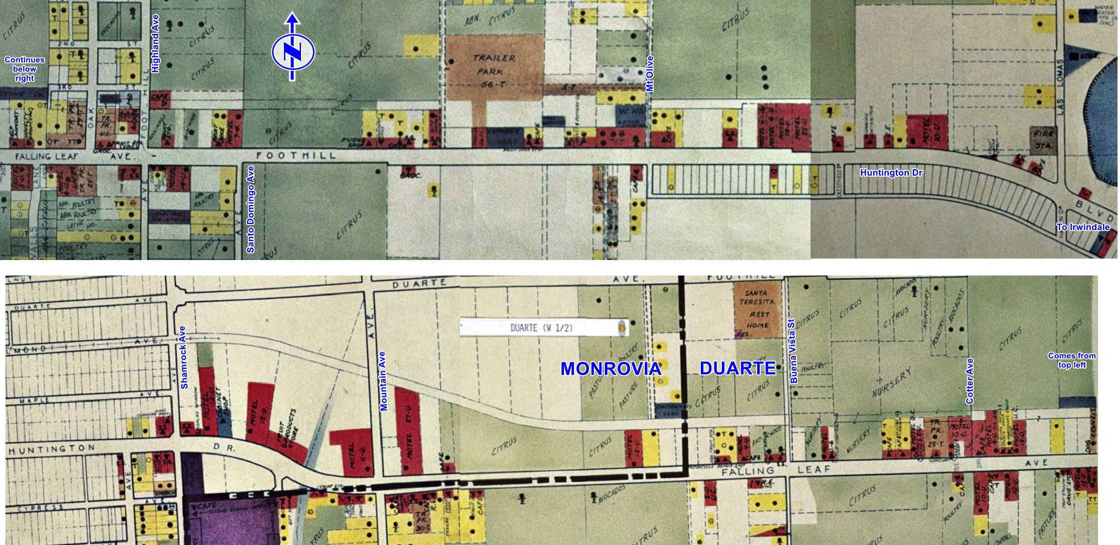 As the 1940s map shows, street names have changed in Duarte: What now is Royal Oak Dr. was Foothill Blvd which turned south along what now is Highland Ave. and then east along what now is Huntington Dr. South of modern Huntington Dr., Highland Ave had the same name it has now, but west of Highland what now is Huntington Dr. was called Fallen Leaf Ave.