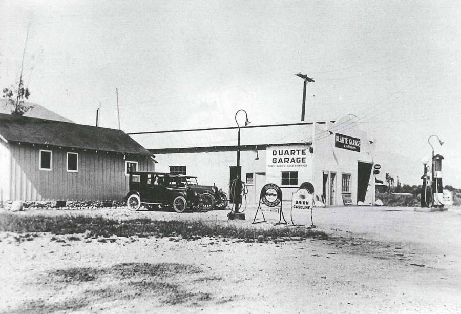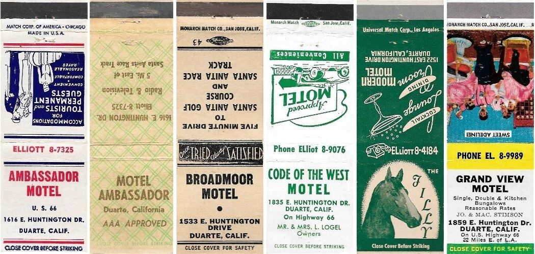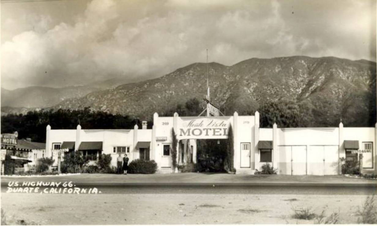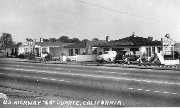 Jack DeVere Rittenhouse rode the whole of Route 66 in 1946 and wrote his "...Guide Book to Highway 66" in which his entry of Duarte is merely one town among many: "More towns you pass through include LA VERNE at 336 mi., GLENDORA, 241 mi.; AZUSA, 343 mi., DUARTE, 347 mi.; MONROVIA, 350 mi.,"