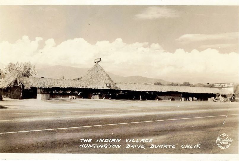 This is one of the few surviving spots on Route 66, Duarte. The The Indian Village Cafe and Zanzibar was originally further west, at 1457 Huntington Dr. It began as "The Indian Village", owned by D.L. Stevens and C.B. Ramsay who sold oranges, reed furniture, baskets and fruit packs at their "Motor Camp De Luxe THE INDIAN VILLAGE" in the 1930s . It evolved into the thatched building shown in the image below, a postcard that says it sold "Chicken Dinners, Fountain and Sandwiches," on the north side of Huntington Drive.