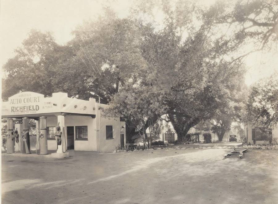 The image below from 1930 shows the gas station and auto court that was located at Highland and Huntington. Oakleigh is an Old English term meaning "clearing among the oaks." an appropriate name for the place.