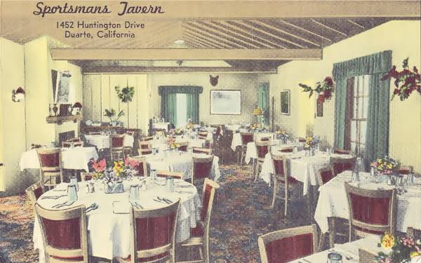 Opposite, on the south side of the road, at 1452 Huntington was the Sportsman, whose postcard stated: "Located 4 miles East of Santa Anita Race Track Rt. 66 "JUST A LITTLE DIFFERENT" Reservations Required on Wild Game Dinners, Closed Mondays." Pictured below.