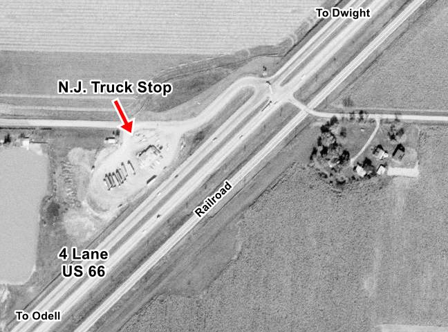 South of this point the four lane alignment runs with a NE-SW course, with its former westbound lanes abandoned to your right. Then the freeway approaches the highway and the original WB set of lanes is buried under its EB ones. Afte half a mile, at the point where E 3000 N Rd crosses both U.S. 66 and I-55 there was an N.J. Truck stop until 1975-76, when it was razed to make way for the freeway. You can see it in this 1968 aerial photograph, it sold Pure Oil and had a Café you can also see it in this 1950s aerial view; this is the spot where it stood.