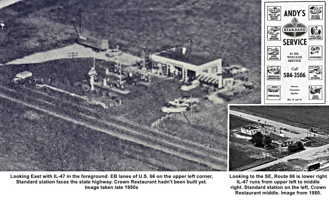 The picture below looks east along IL-47 at the crossroads with Route 66 running across the image (left to right), you can see the Standard station and the Crown Restaurant.