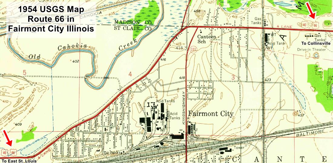 At that time, City Route 66 barely grazed western Fairmont City: coming from Granite City it met US40 and turned west into East St. Louis. Only in the 1950s was the higway aligned south of Hamel through Troy, Collinsville and then together with US 40, along Collinsville Road through town.