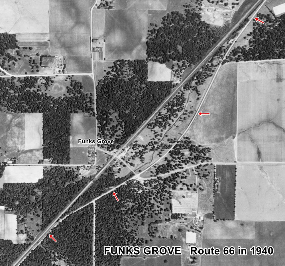 The road continues towards Funks Grove, where the original State highway #4 and the original 1926 Route 66 alignment ran along a now partly closed alignment that curved eastwards from the current straight alignment; it can be seen (red arrows) in the thumbnail image (click on it to enlarge), that shows a 1940 aerial view of the area. We also marked it with a yellow line in our custom map. The northern part of the roadbed is still there hidden in the forest as you can see in this satellite view. A better image of the original alignment can be seen in this 1970 aerial photo, as an arched segment to the left of the current alignment.
