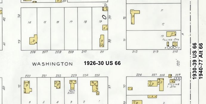 Route 66 turned sharply right along E Jefferson St., and then sharply south (left) at the tracks along S Jackson St. Five blocks south it turned west (right) along E Parker St. This is where it meets the later alignment that curves around the eastern and southern sides of town. At one time there was a filling station on the NW corner of Jackson and Parker, and two gas stations facing each other between S Grundy and S East St. This roadway carried Route 66 from 1926 to 1944 and then it carried Alt 66 until 1967.