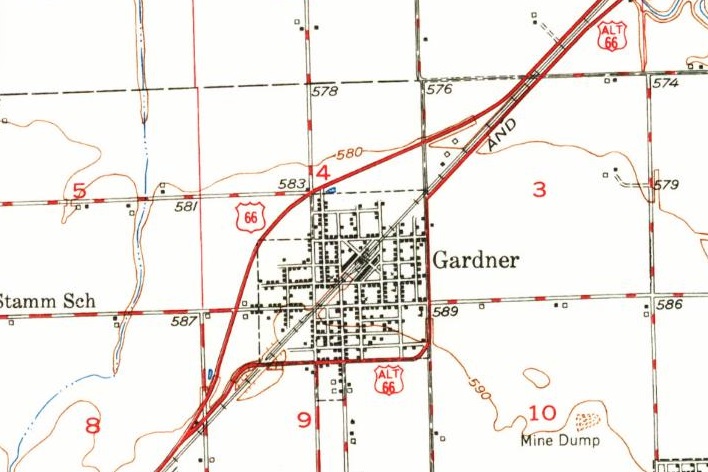 Gardner lies to the east of US 66 here. There are gas stations and a cafe on US 66 at this intersection... Rittenhouse (1946)