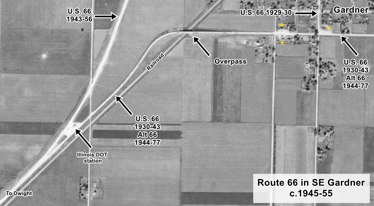 The 1926 alignment from Gardner, Braidwood all the way to Romeoville through Joliet became ALT US 66 and remained so until 1966. The Alternate 66 alignment was eliminated in February 1967 and replaced by Illinois State Highway 53 from Welco Corners to Gardner.1