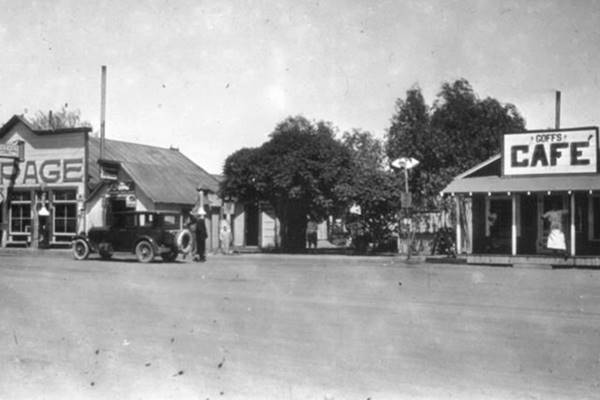 The original 1926 alignment was a dirt surfaced road, in 1926, the new alignment that ran further south was paved. We have a photograph of Goffs in the 1920s or early 1930s showing what it was like at that time, notice the car, the gas pump at the Garage (left) and the Cafe (right):