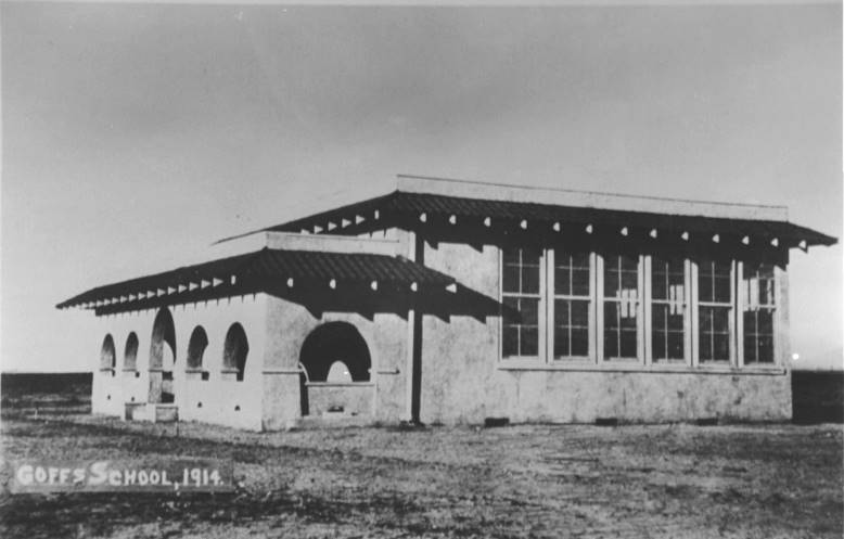 Three years later, the Shoolhouse building at Goffs was built by San Bernardino County. It opened in 1914. It is a one-room, one-floor building designed in Mission Revival style by architect Anthony Beimer.It also served as the local library and the community center.
