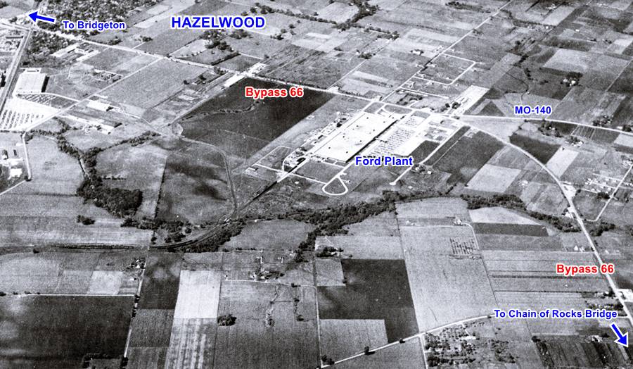 The following map from 1955 shows Route 66 in St. Louis vicinity. Hazelwood is located on the north side of the "St. Louis Municipal" airport.