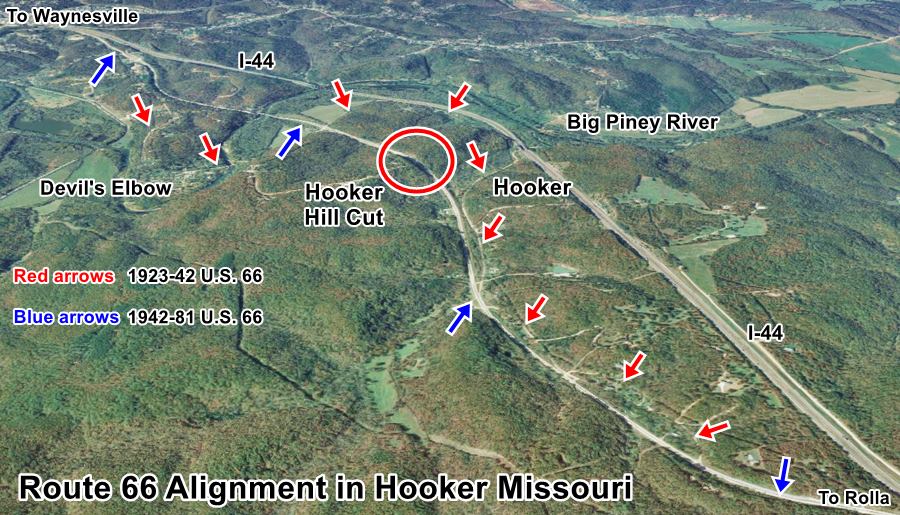 At I-44's Exit 169, Route 66 is cut by the freeway, and after this point it runs along the south side of the interstate from Clementine into Hooker. The original two-lane alignment is shown in this 1926-1943 US 66 Map. This alignment is shown in Blue in the map. There is a gap in the alignment (black line) where I-44 obliterated part of the old road. Then comes the western segment that goes through Devil’s Elbow shown in Blue in the image, and also in this map.