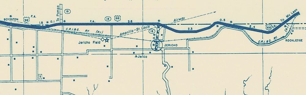 The first alignment of Route 66 in Jericho, along the Postal Highway, more or less followed the railroad tracks until it reached the eastern side of Jericho, where it headed south, running 1⁄4 of mile further south, to avoid a series of large shallow lakes on the flat area where Jericho was located, right on the divide between the Red River to the south, and the Canadian River to the north.
