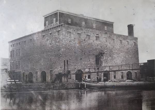 The structure to the left (west) was built in 1838 and designed by Erastus and William Newton with a partial 3rd story added in 1859. The stone building to the right, by the tracks was also added in 1859. It was built as a warehouse on the I&M canal and owned by George Gaylord (1820–1883), a Lockport merchant for several yers. The engraving below shows it in the late 1800s and is captioned "Warehouse & Store of Col. Geo. B. Martin Lockport Ill."