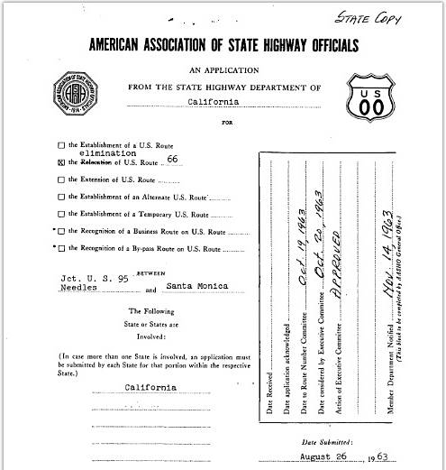 On Aug 26, 1963 the state's Higway Commission (CHC) requested the "Elimination of Route 66... Between Jct. U.S. 95 Needles and Santa Monica" it was approved by the AASHO on Nov. 14, 1963. I-40 and I-15 replaced the former alignment between Needles and Santa Monica. At the same time the state had also requested eliminating Alt 66 from Pasadena to Los Angeles through Eagle Rock. This was also authorized. 1