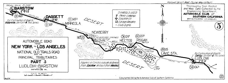 The 1912 map of the Automobile Club of Southern California (ACSC) shows how tough the road was: west of Ludlow the road climbed a 15% Grade towards Argos (5 mi.) and then "Sand - Hard Pulling" into Lavic (9 miles west of Ludlow). There the N.O.T. road crossed to the south side of the Santa Fe track and climbed a 10% Grade of Heavy Sand, crossing a dry lake well to the south of the black lava beds that the railway crossed. It passed far to the south of the station named Hector and after passsing through another Dry Lake 29 miles west of Ludow at Troy (it seems that the person who named the stations was inspired in Homer's Illiad), it reached a "Fine Spring" next to the "alkali marsh" at Newberry Springs. Which, at that time had no services for the traveller (37 mi. from Ludlow).