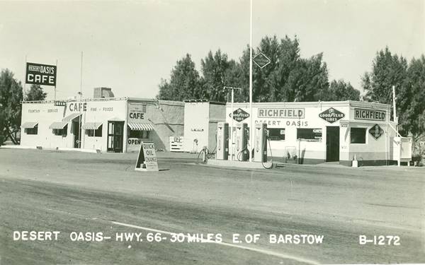 Poe's became the Desert Oasis, which switched to Richfield gasoline, but otherwise left the building unchanged as you can see in the 1950s image below captioned "Desert Oasis - Hwy. 66 - 30 miles E. of Barstow":