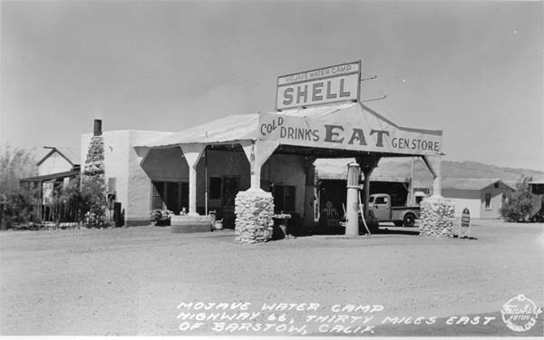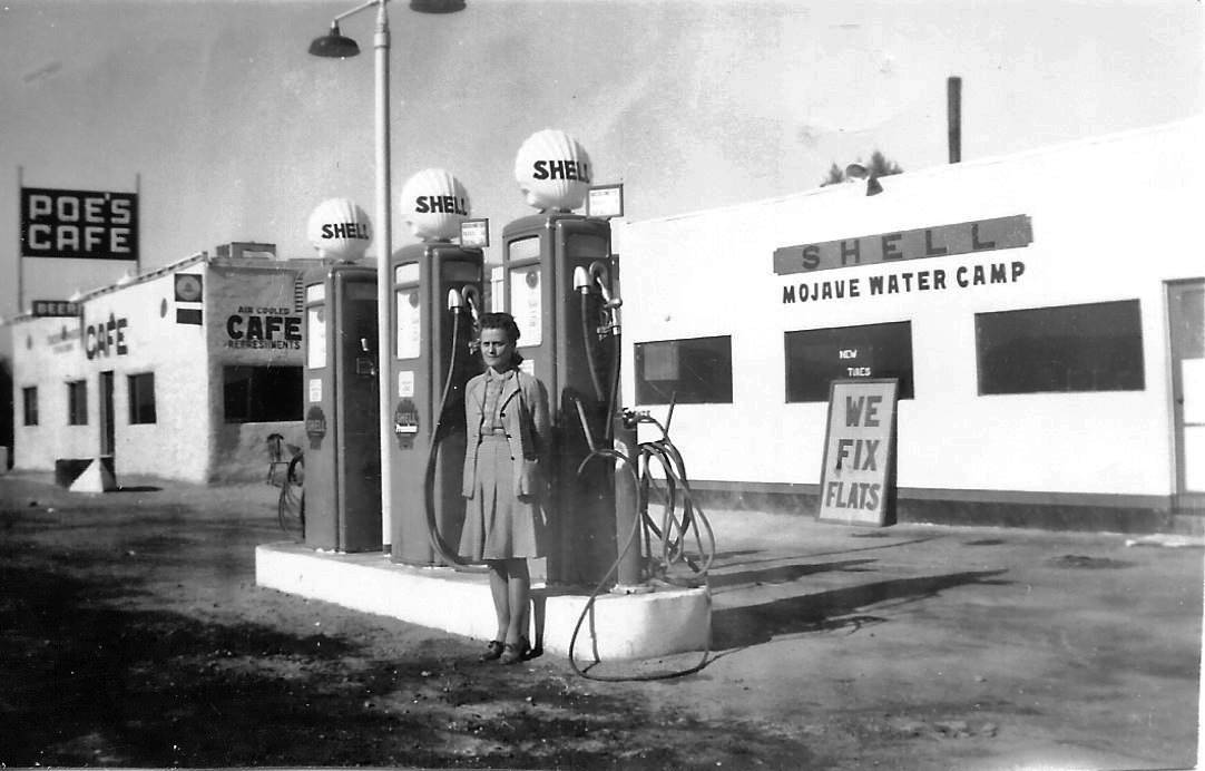 Another view of Poe's in the 1940s, notice how the building has a sign reading "Mojave Water Camp", this one looks towards the northwest. Notice those classic Shell gas pumps.