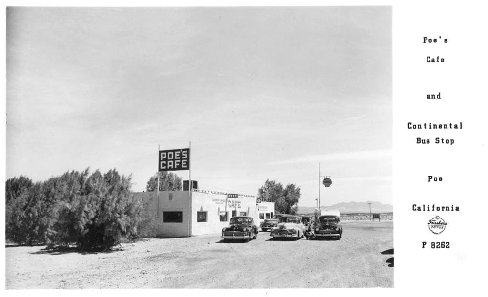 On April 18, 1957 the "Desert Gas Station - Destroyed by Fire... the service station was destroyed ... and later threatened to engulf Poe's Cafe nearby" (10). James W. Ferguson purchased the cafe in 1963