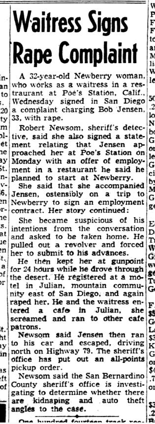 Poe sold his business in 1952. Later that same year, the San Bernardino County Sun reported that on September 11, 1952, a 33 year-old waitress that worked "in a restaurant at Poe's station, Calif." whose name was not revealed due to the nature of the crime, was abducted by Bob Jensen, 33, and raped by him. He had offered her a job in a restaurant he said he'd open in Newberry and she got into his car to go to the town to sign the employment contract. He raped her at gunpoint and drove her to Julian, close to San Diego where she managed to escape. Jensen fled but was shot dead by the state police in Pennsylvania on October 20, 1952 (7) (8).