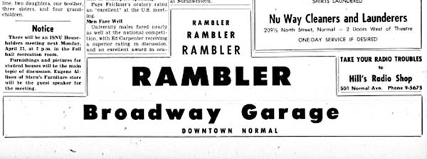 Jack DeVere Rittenhouse mentions Normal in his "A Guide Book to Highway 66," which he published in 1946. He says that Normal and neighboring Bloomington are "virtually one community... city limits adjoining along one side," he adds that Normal was the location of the "Illinois State Normal University" and also that the town had "stores; hotels; Broadway Garage." However, he drove around it using the "beltway" alignment, avoiding City 66 with its congestion.
