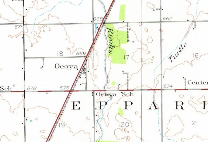 The small community of Ocoya was born as a station on the Chicago & Alton Railroad in 1854. Duff and Cowan, from Pointiac platted it. Its post office opened in 1860 (now closed). Overshadowed by Chenoa and Pontiac, it remained tiny: it still has some grain elevators and a few scattered homes and perhaps 30 residents.