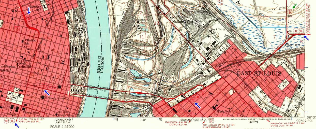 Click on the thumbnail map image to see a full size version. Main Route 66 coming from Collinsville (blue arrow right side of the map) reaches the old City 66 from Granite City (now ALT US 67 -green arrow upper right side of the map), it heads toards the Mississippi River (blue arrow lower right) crossing the Bridges into St. Louis. On the left-center side US 66 reaches St. Louis and the original City 66 coming from Chain of Rocks Bridge (blue arrow upper left). It turns to head westwards out of St. Louis (blue arrow lower left). You can also see how US 40 and US 66 shared the same alignment into St. Louis.