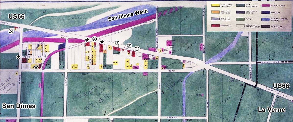 The 1947 land use map of San Dimas (click on it to enlarge it) shows us what buildings were located along Route 66 at that time. As you can see, most of the area was farmland (green), the dry wash runs across the top (light blue), some homes in yellow and orange, water pumping plants and utilities (violet), and a few commercial buildings (red); we marked these as follows: Those with a (*) were the four auto courts (motels) in town; along Foothill there was an "apple Stand" (1), followed by a "Cafe" (2), a "Florist" (3), and a "General Store" (4). There was a "Drink Stand" on the NE side of San Dimas Wash (5). None have survived.