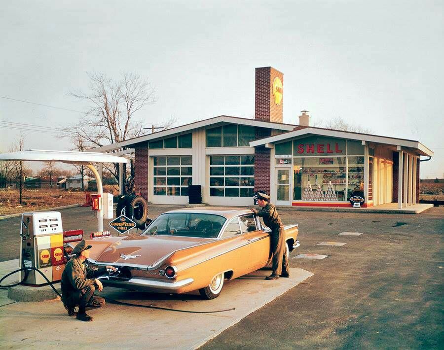 In 1957 Shell launched the ranch style service station, it had a residential look, brick veneer, a large gable roof, no canopy, and a brick-faced chimney-like extension on the roof with the company logo.