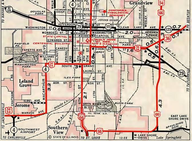 Jack D. Rittenhouse drove along Route 66 in 1946 and wrote his classic "Guidebook of Route 66." In it he mentions Springfield quite extensively. Coming from the north he writes that after crossing the Sangamon River you "begin to enter the outskirts" of the city. He added that those wishing to visit the city follow "the main route of US 66 [that] passes through the town, near the business district." He mentions the "Bypass 66" also as well as the Illinois State Fair Grounds "about 3 miles from the center of town."