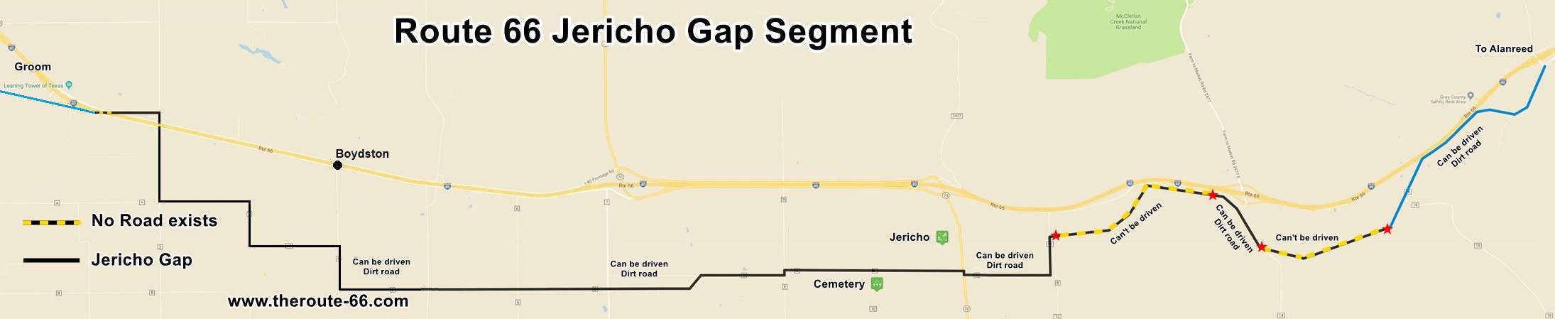 Follow I-40 west and leave it at Exit 124, get on to TX-70 southbound, cross to the south side of I-40. Here you can visit the old Jericho Cemetery, a few miles southwest of the Exit and drive the western part of the Jericho Gap into "Boydston". The alignment has a gap at each end.