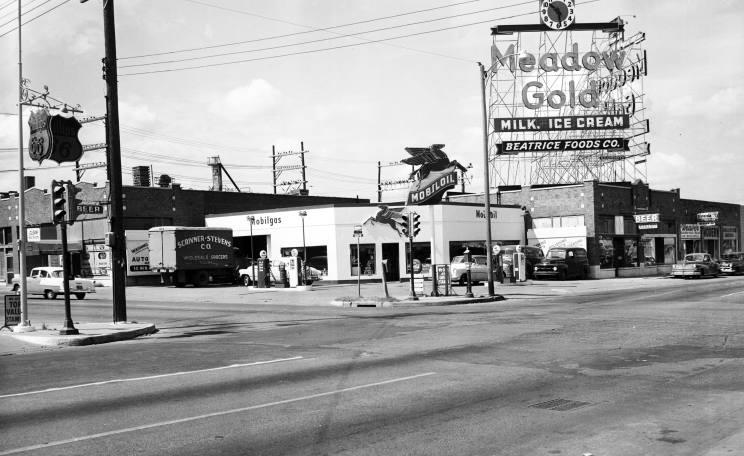 The Meadow Gold Neon Sign stood on this corner from 1934 until 2004 when it was taken down, preserved and restored as the building on which it had stood was demolished.