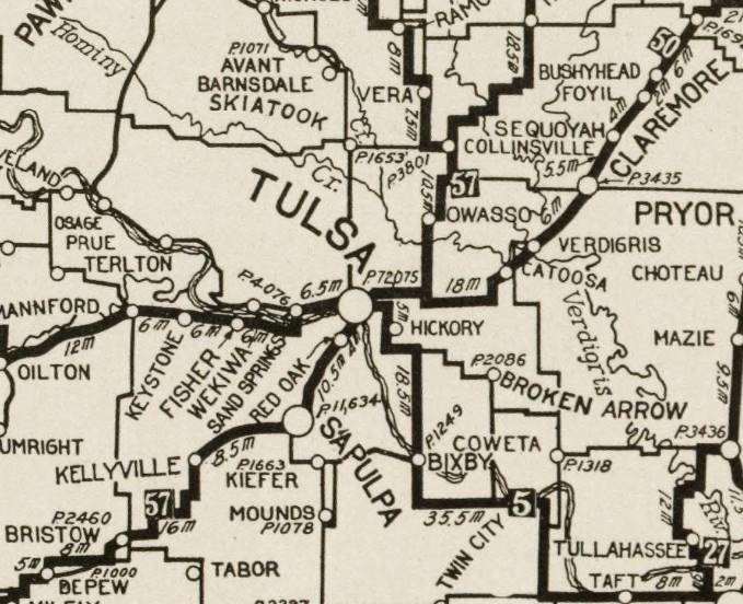 Original 1926-32 alignment. Along Mingo norhtwards, then took a left along Admiral Place. A left onto Lewis and a right along 2nd, into the town. Then: Detroit, 7th, Cheyenne and 11th Street, to Maybelle and then across the 11th St. Bridge. On the western side of the River it followed Southwest Blvd. (in those days Quanah Ave.)