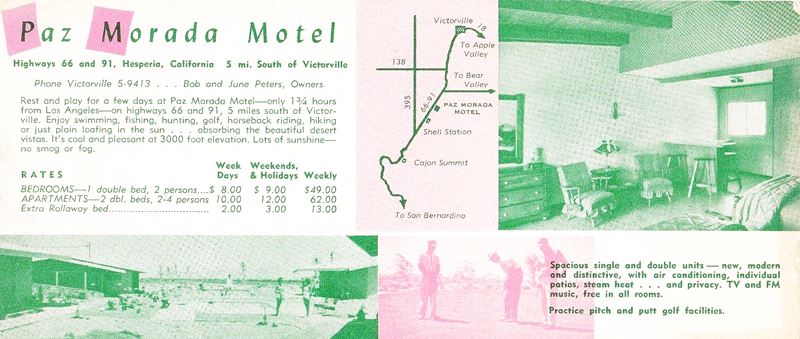 Paz Morada means "peaceful dwelling" in Spanish. This motel was intended as a destination, not for one night, but to "Rest and play for a few days at Paz Morada Motel - only 1 3⁄4 hours from Los Angeles... enjoy swimming, fishing, hunting, golf, ...hiking or just plain loafing in the sun... Lots of sunshine -no smog or fog... two heated swimming pools, a wading pool, shuffleboard and a playground for the kiddies. Horse corral and miles of good riding". Its daily rates were only $8 on weekdays for bedrooms (2 guests) and $9 on weekends and holidays.