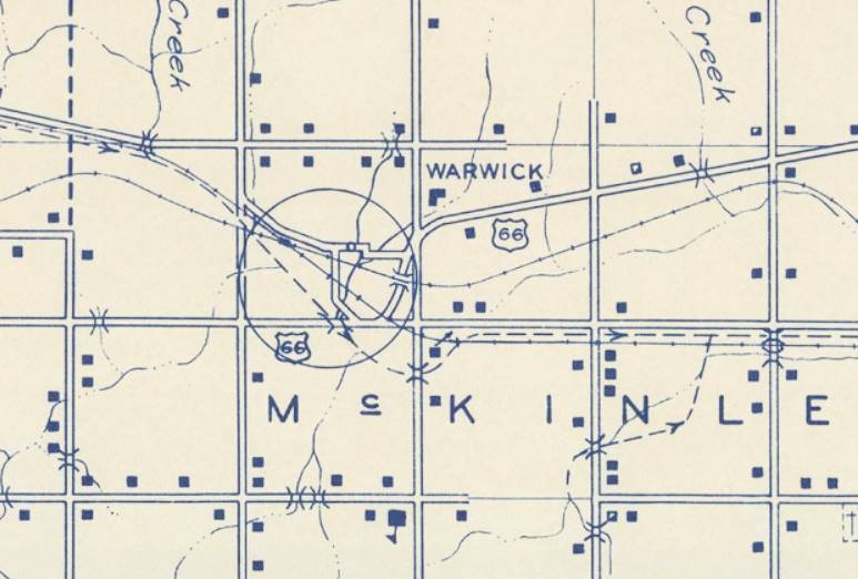 Jack Rittenhouse does not mention Warwick in is Guidebook to US Highway 66, published in 1946. He wrote about two service stations, one is 2 miles west of Chandler (which has vanished without a trace), and another one seven miles from Chandler and four miles east of Wellston: "another gas station with grocery and garage. More gas at 79 mi."